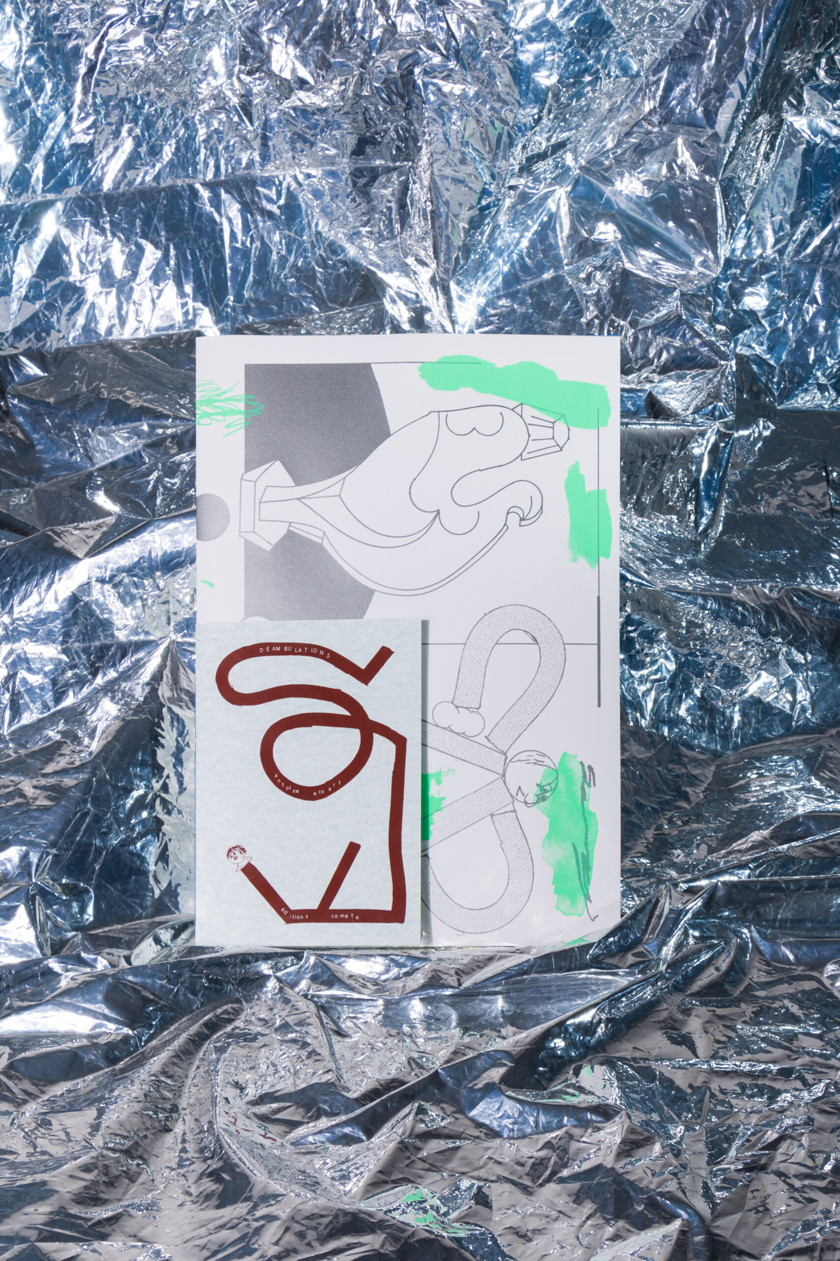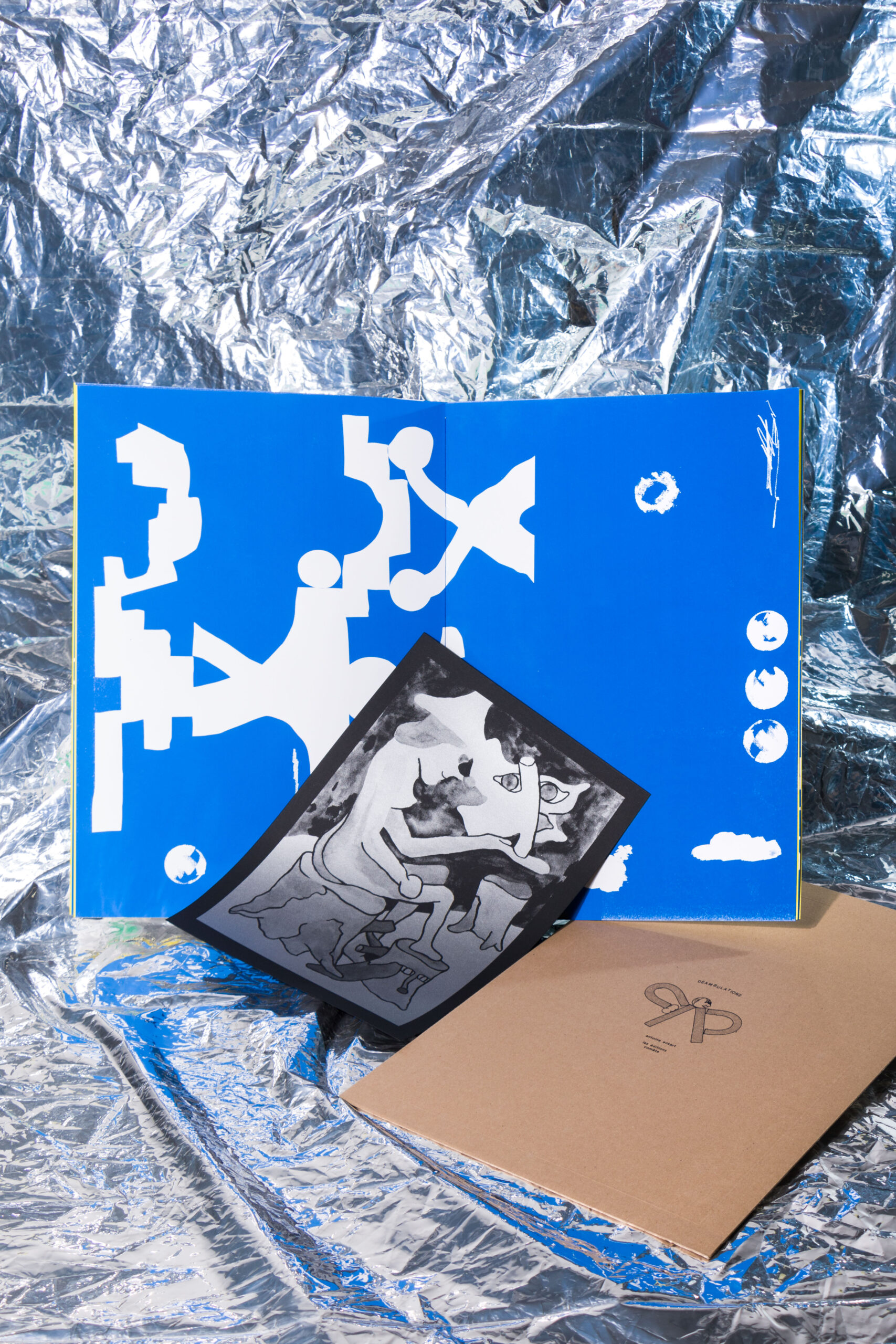 DÉAMBULATIONS / 32 silkscreen-printed pages / small and large pages / final format 32.2 × 46 cm / metallic printing / positive and negative compositions / hand-sewn binding / delivered in a cardboard case / edition of 50 copies