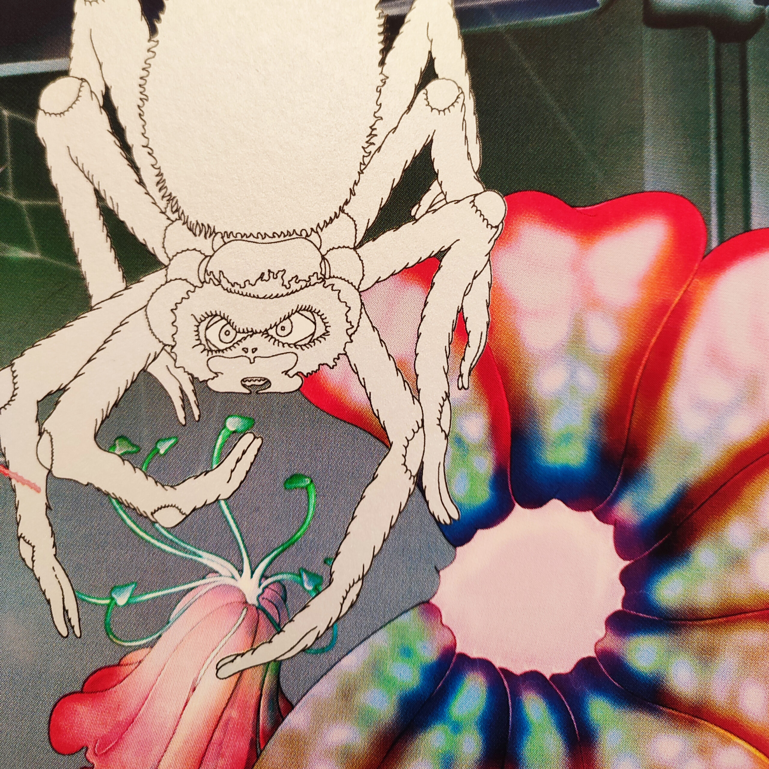 imprimée en hexachromie (cyan, magenta, jaune, noir, vert et orange) avec un passage d’encre iridescente pour l’araignée et sa toile.